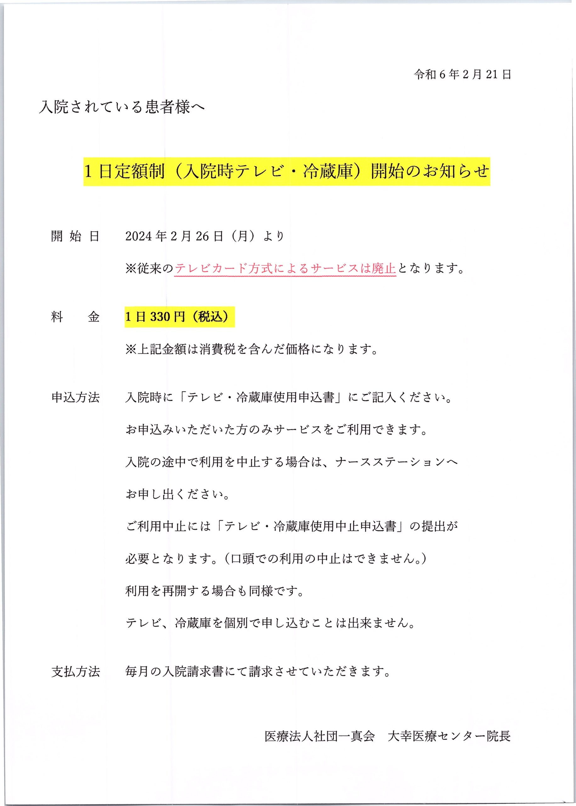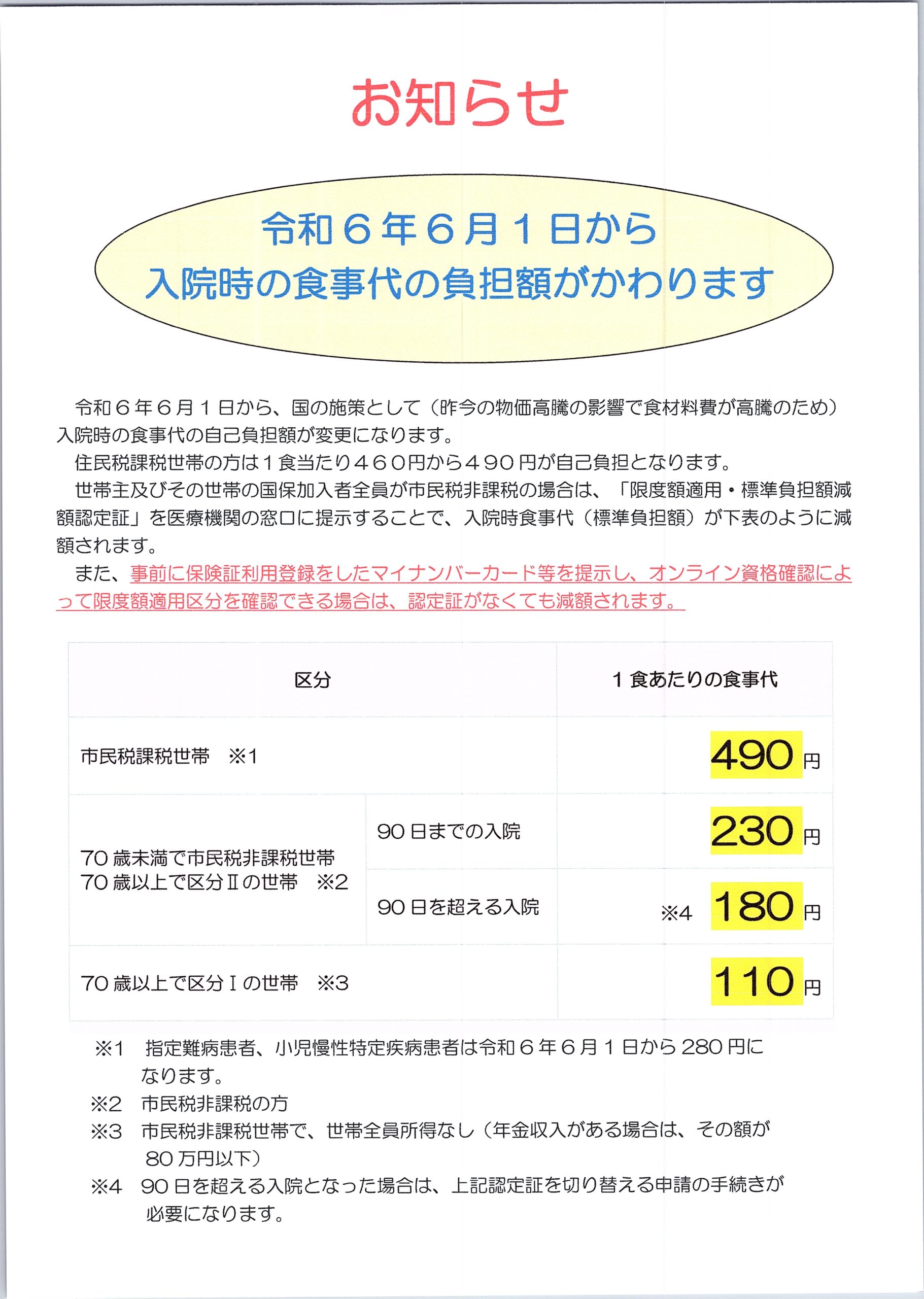 ※ 令和6年 6月 1日 より 入院時の食事代の負担額がかわります。  詳しくは、こちら